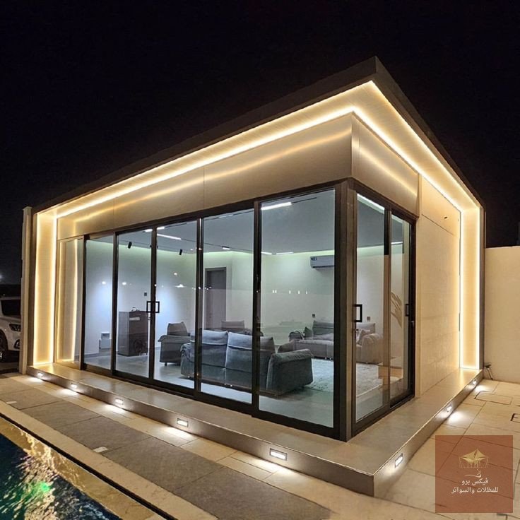 - الخصوصية الذكية: إمكانية إضافة “ستائر كهربائية” أو استخدام “الزجاج الذكي” الذي يتحول من شفاف إلى معتم بضغطة زر.